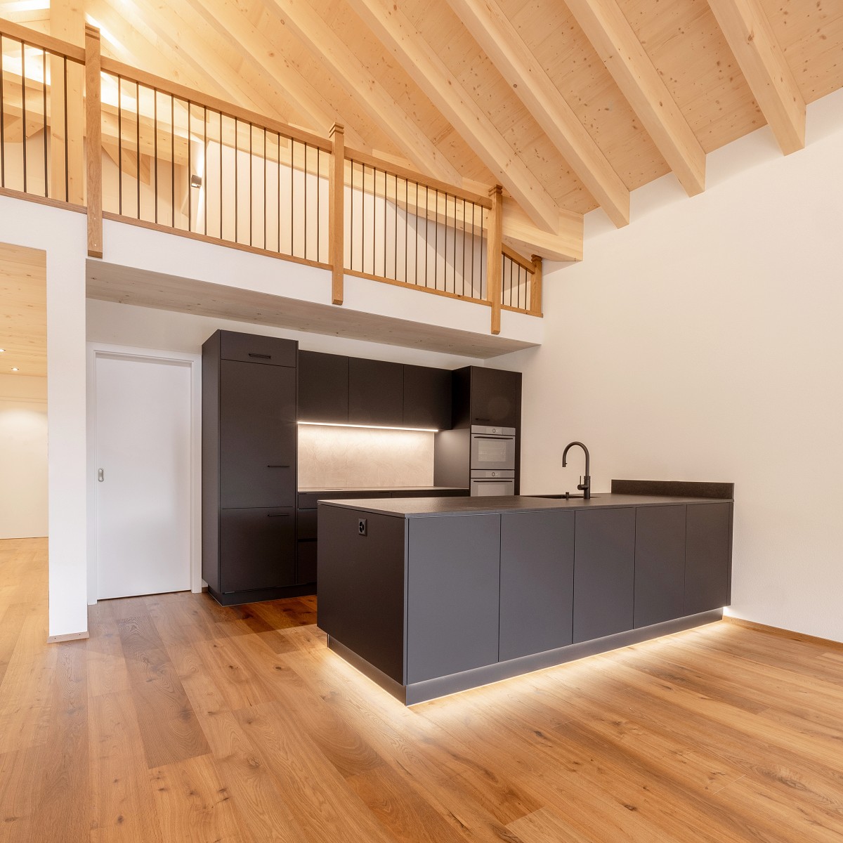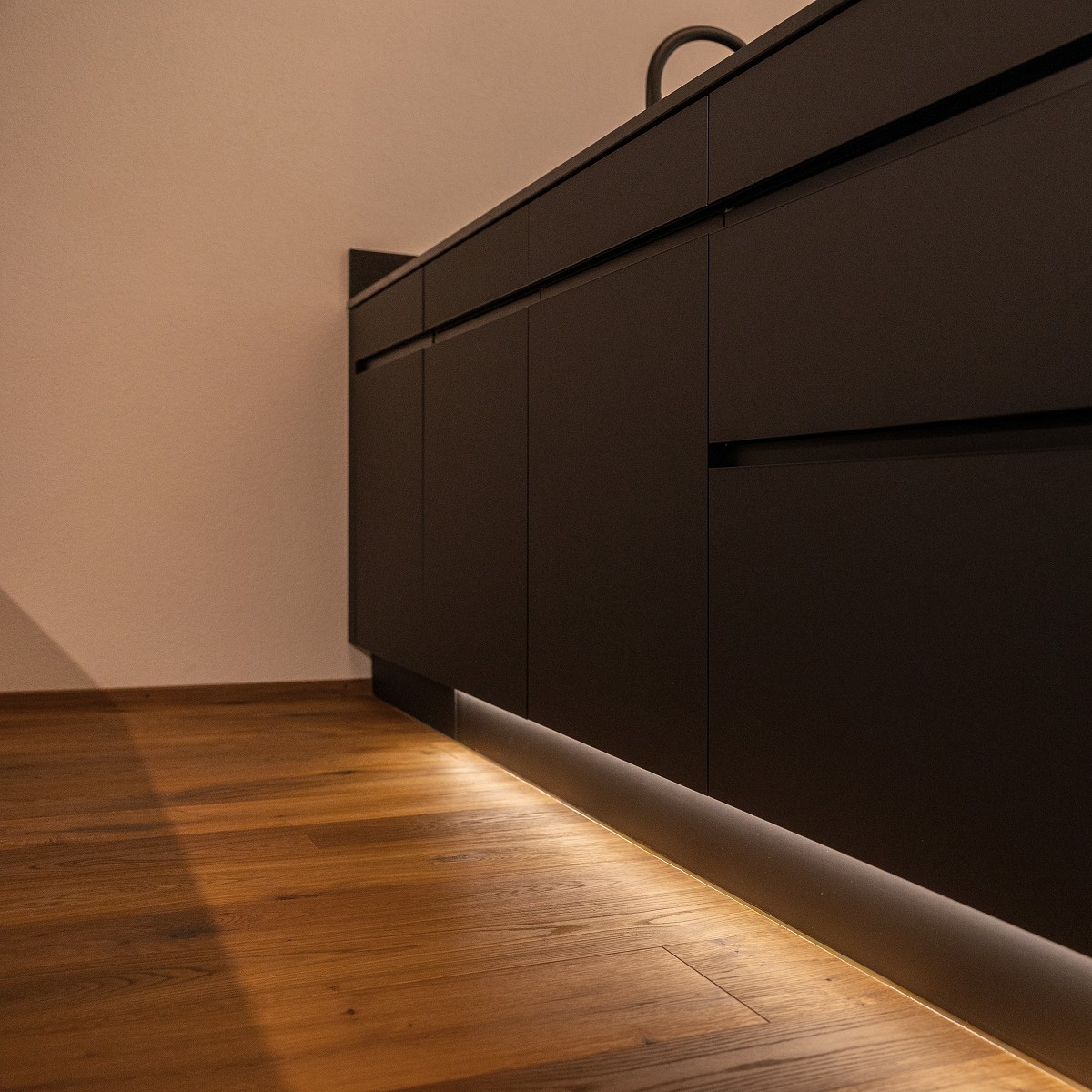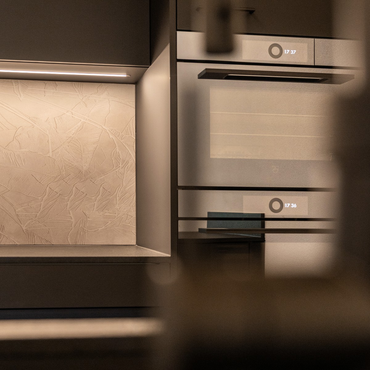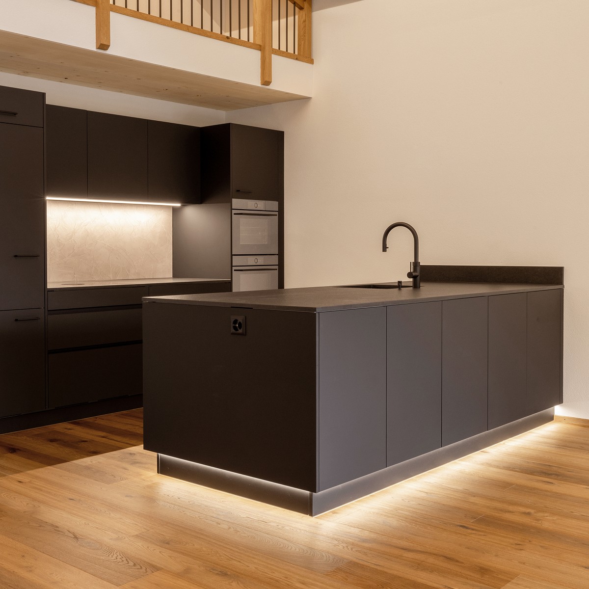 Die großzügige Insel wirkt durch die Sockelbeleuchtung beinahe schwebend. Eine fein strukturierte Rückwand verleiht dem Arbeitsbereich Charakter und Tiefe. Intelligente Stauraumlösungen sorgen für Übersicht und kurze Wege.