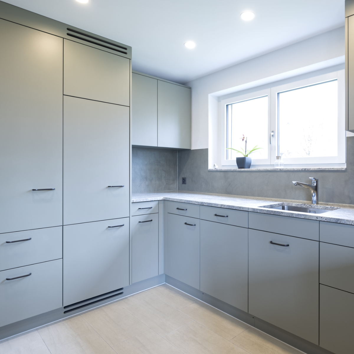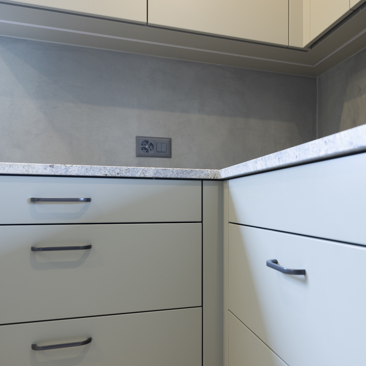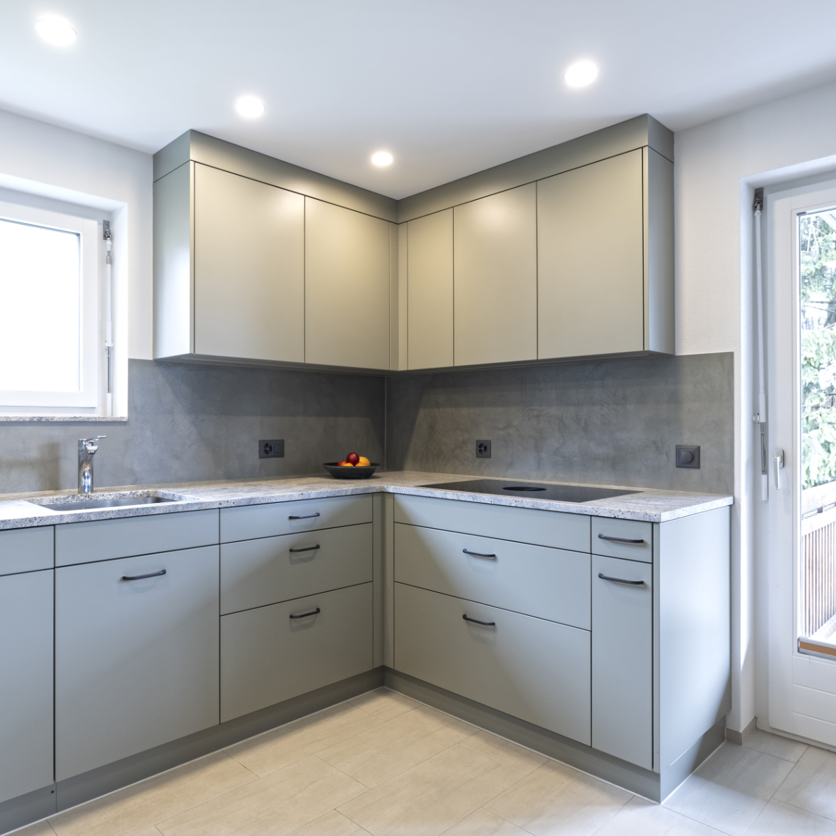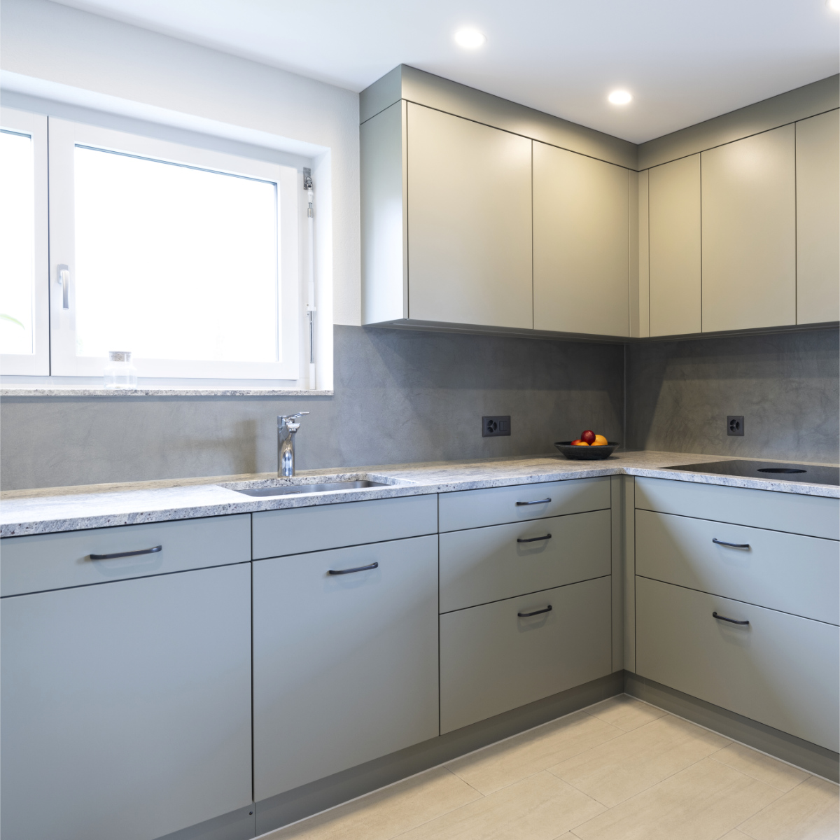 Dieser Küchenumbau verbindet klare Linien mit einer modernen Farbgestaltung in Olive. Besonders hervorzuheben ist die fugenlose Rückwand aus Naturofloor, die der Küche eine edle, mineralische Optik und eine harmonische Gesamtwirkung verleiht.