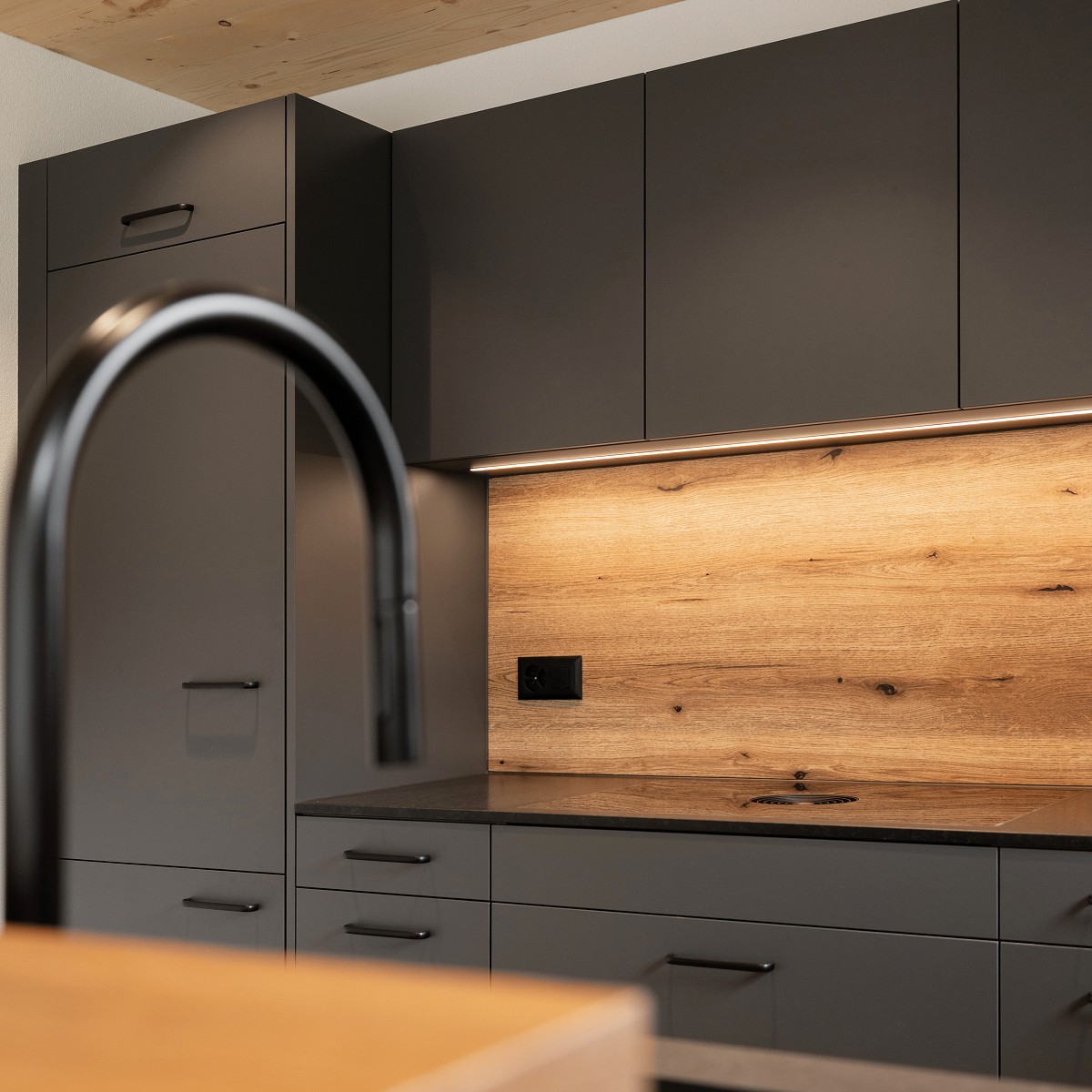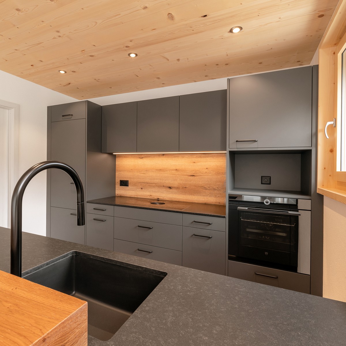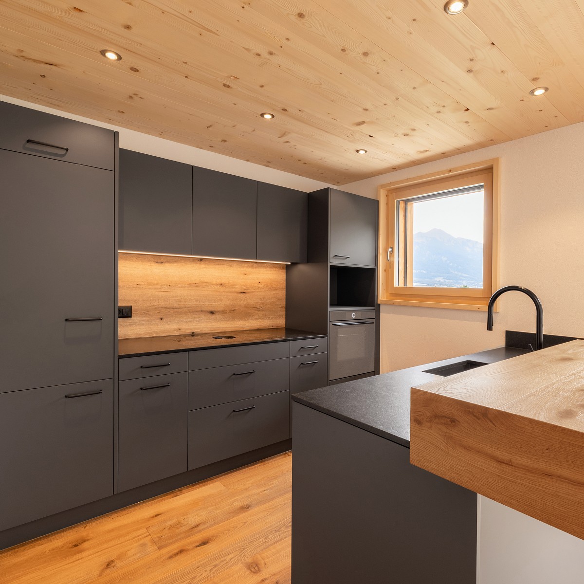 Moderne Küche mit Alpenblick – natürliche Wärme trifft auf klare Eleganz