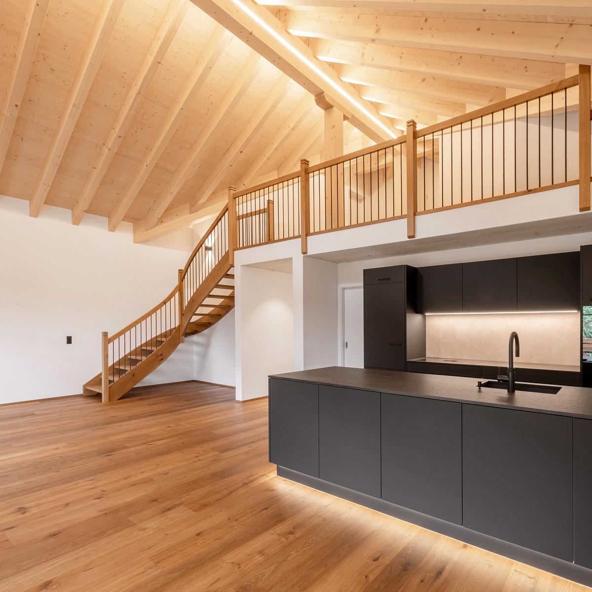 Die integrierte Beleuchtung entlang der Sparren setzt das Holz abends in ein warmes Licht, das die Struktur erst richtig zur Geltung bringt.