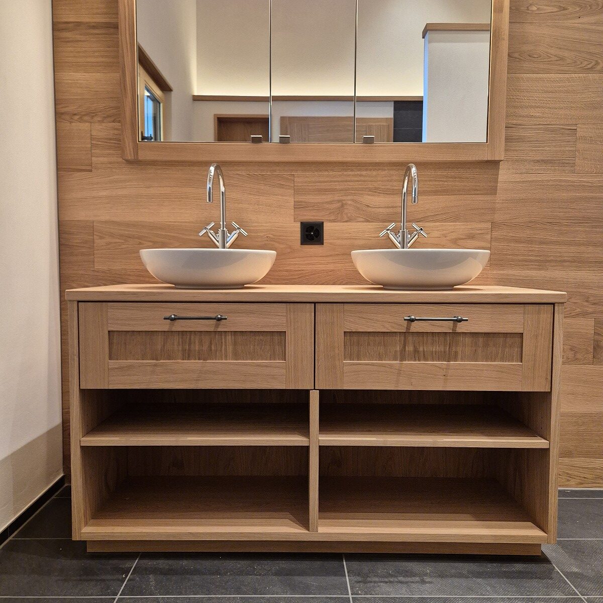 Dazu passend: eine kleine Kommode mit Eichenabdeckplatte, die denselben Materialrhythmus aufgreift und den Schrank zu einem stimmigen Gesamtensemble macht.