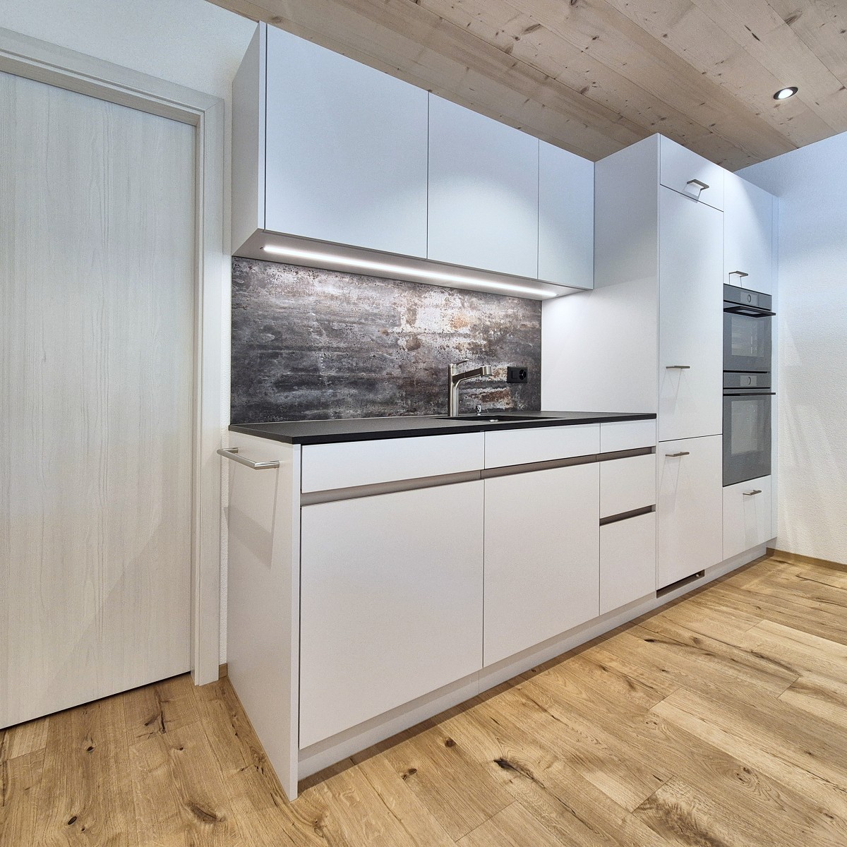 Die Rückwand in Beton-Optik aus RockoPlatte verleiht dem Raum einen modernen, industriellen Charakter, während die weissen, grifflosen Fronten für zeitlose Eleganz sorgen.